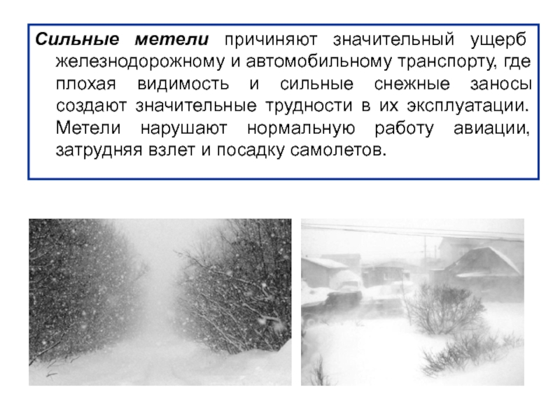 Слайд 73Сильные метели причиняют значительный ущерб железнодорожному и автомобильному транспорту, где