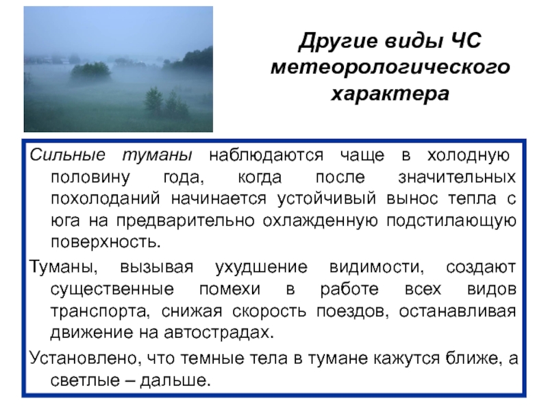 Туманы, вызывая ухудшение видимости, создают существенные помехи в работе всех видов транспорта, снижая скорость поездов, останавливая движение на автострадах.