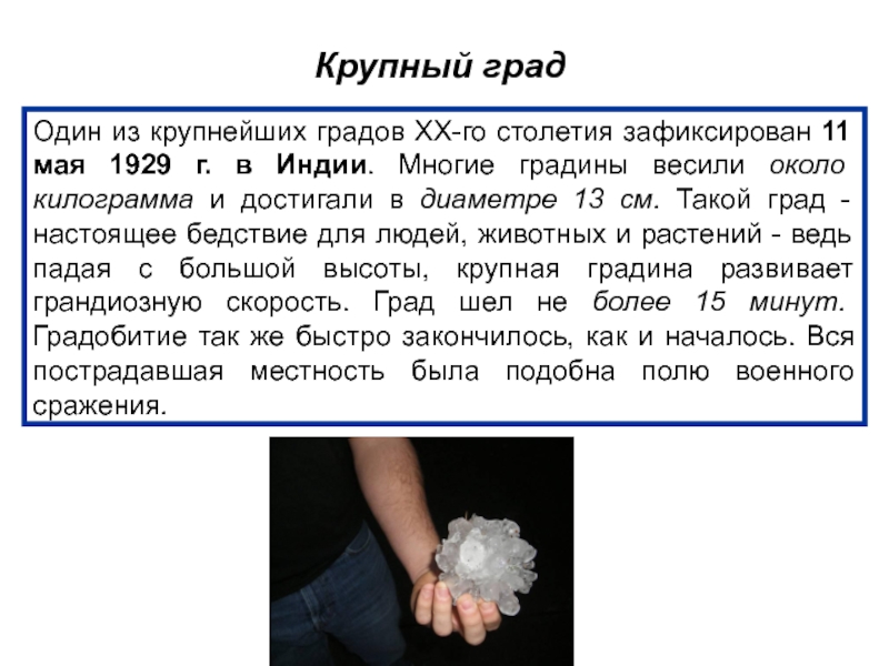 достигали в диаметре 13 см. Такой град - настоящее бедствие для людей, животных и растений - ведь падая с большой высоты, крупная градина развивает грандиозную скорость. Град шел не более 15 минут. Градобитие так же быстро закончилось, как и началось. Вся пострадавшая местность была подобна полю военного сражения.