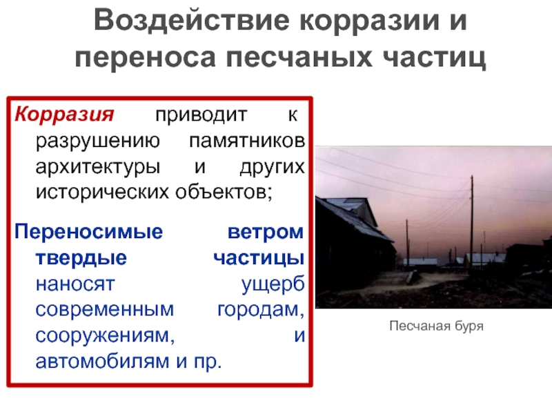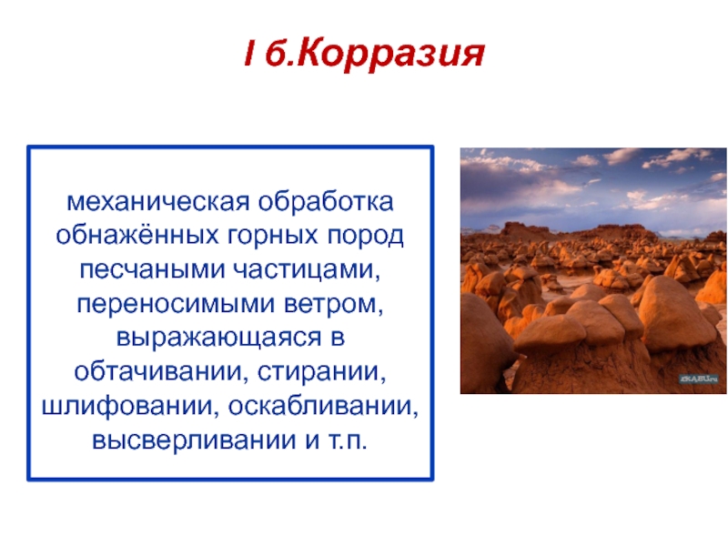 песчаными частицами, переносимыми ветром, выражающаяся в обтачивании, стирании, шлифовании, оскабливании,