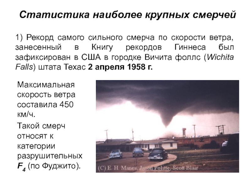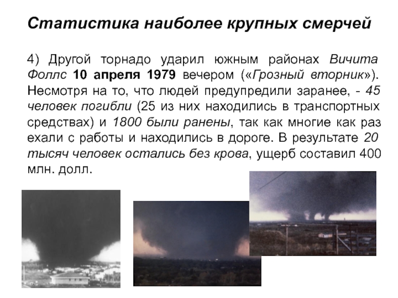 20 минут прошёл по территории США 500 км, убив 110 человек. Ширина расплывчатой воронки этого смерча составляла 0,4-1 км, внутри неё была видна бичеподобная воронка.