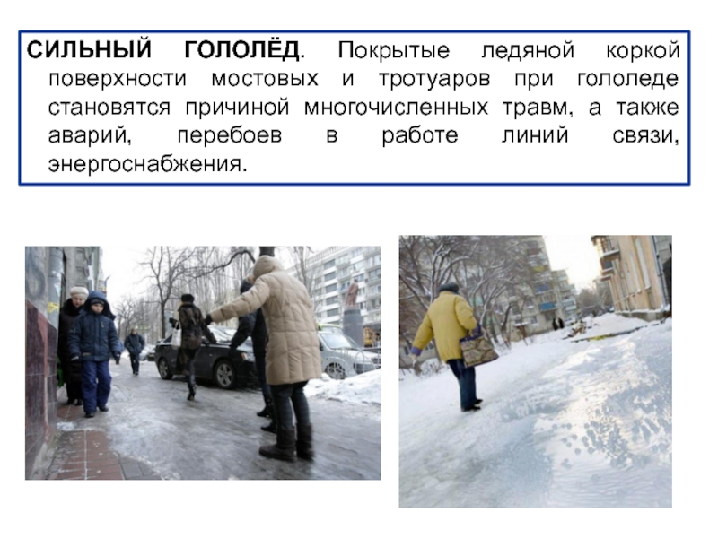 Слайд 77СИЛЬНЫЙ ГОЛОЛЁД. Покрытые ледяной коркой поверхности мостовых и тротуаров при