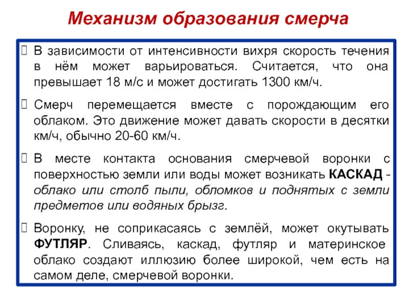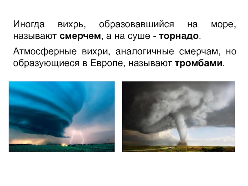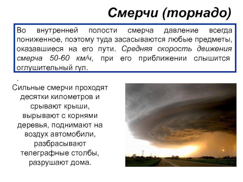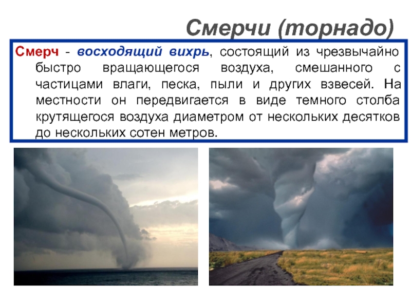 Сильный ветер - это движение воздуха относительно земной поверхности со скоростью свыше 14 м/с. При дальнейшем усилении ветра возникают бури, ураганы, шквалы, смерчи.