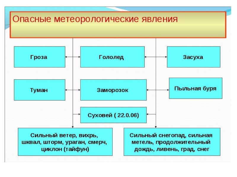К ним относятся: бури, грозы, ураганы (12-15 баллов), смерчи, торнадо, швалы, вертикальные вихри, крупный град, сильный дождь, ливень, сильные: снегопад, гололед, метель, жара, туман, засуха, суховей, заморозки, лавины, пыльные бури.