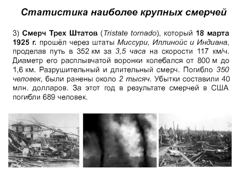 Индиана, проделав путь в 352 км за 3,5 часа на скорости 117 км/ч. Диаметр его расплывчатой воронки колебался от 800 м до 1,6 км. Разрушительный и длительный смерч. Погибло 350 человек, были ранены около 2 тысяч. Убытки составили 40 млн. долларов. За этот год в результате смерчей в США погибли 689 человек.
