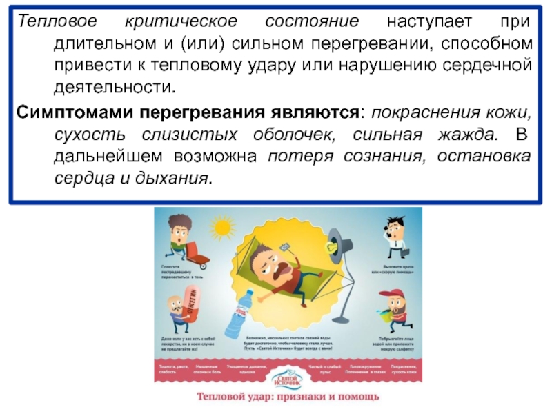перегревания являются: покраснения кожи, сухость слизистых оболочек, сильная жажда. В дальнейшем возможна потеря сознания, остановка сердца и дыхания.