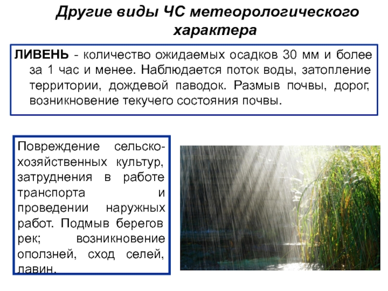 Повреждение сельско-хозяйственных культур, затруднения в работе транспорта и проведении наружных работ. Подмыв берегов рек; возникновение оползней, сход селей, лавин.