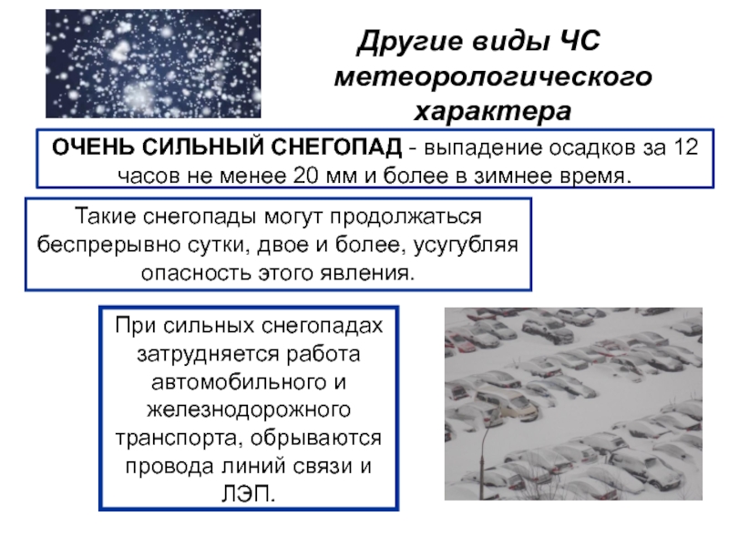 При сильных снегопадах затрудняется работа автомобильного и железнодорожного транспорта, обрываются провода линий связи и ЛЭП.