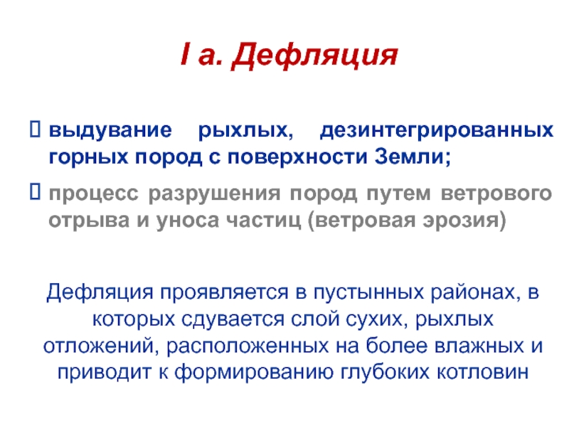 Дефляция проявляется в пустынных районах, в которых сдувается слой сухих, рыхлых отложений, расположенных на более влажных и приводит к формированию глубоких котловин