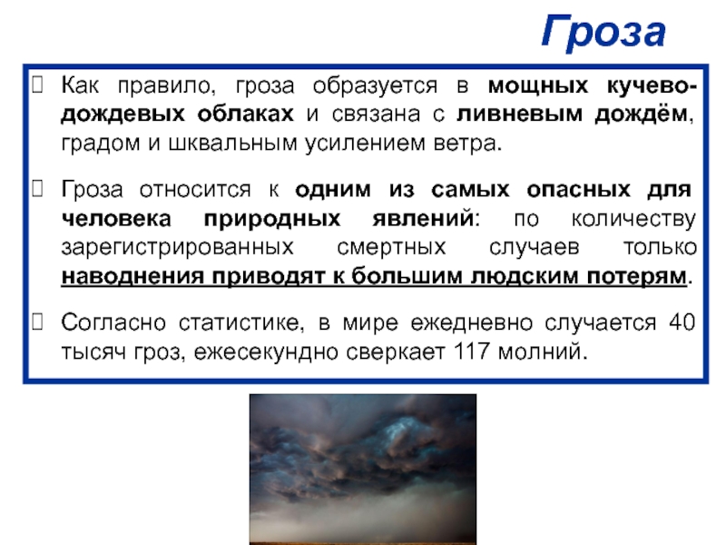 Слайд 5Как правило, гроза образуется в мощных кучево-дождевых облаках и связана