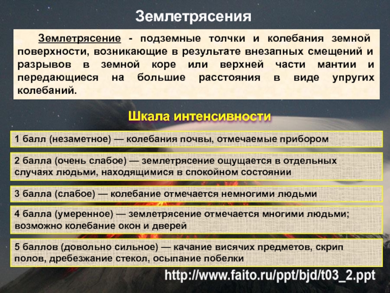 Землетрясение - подземные толчки и колебания земной поверхности, возникающие в результате внезапных смещений и разрывов в земной коре или верхней части мантии и передающиеся на большие расстояния в виде упругих колебаний.