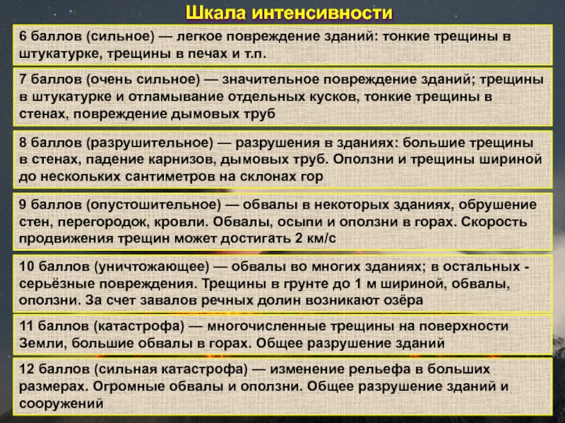 11 баллов (катастрофа) — многочисленные трещины на поверхности Земли, большие обвалы в горах. Общее разрушение зданий
