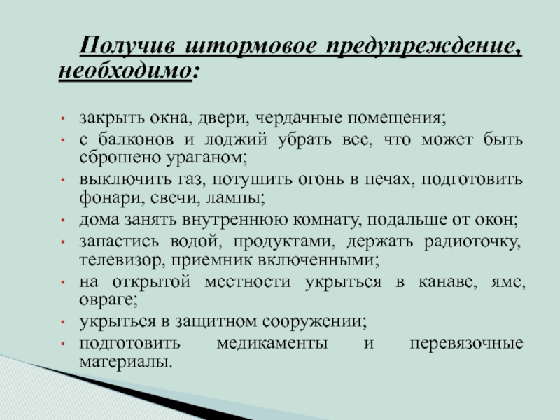 Остаться в помещении, при наличии верхних этажей подняться в эти помещения, плотно закрыть окна и двери, дымоход, вентиляционные люки ;