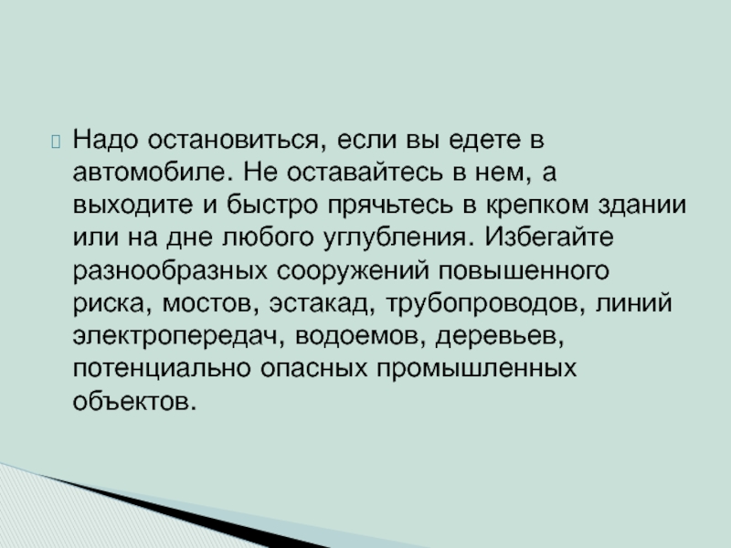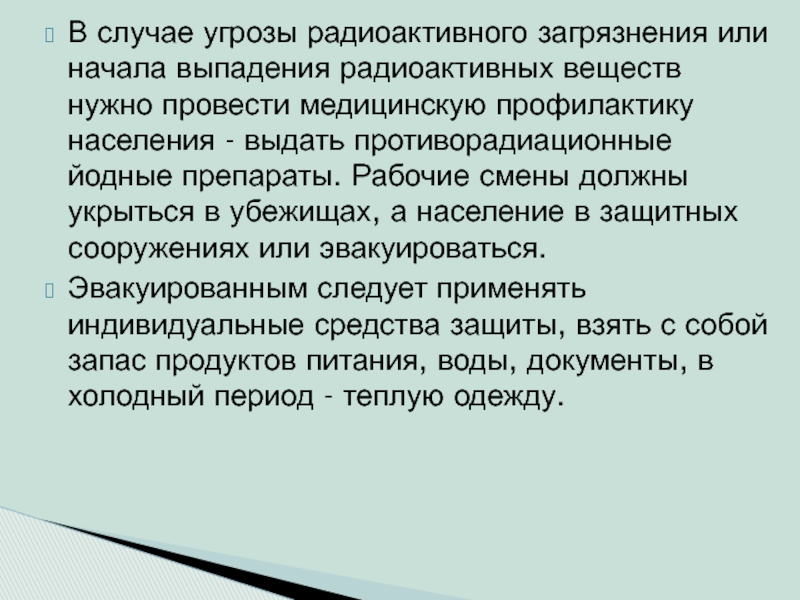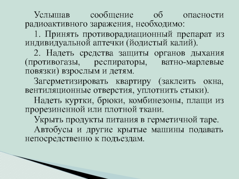 уровнями радиации, концентрациями ядовитых или сильнодействующих ядовитых веществ. Выходить из помещений до прибытия транспорта нежелательно. Следует строго соблюдать режим радиационной защиты.