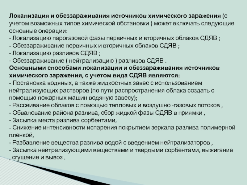 Слайд 9Локализация и обеззараживания источников химического заражения (с учетом возможных типов