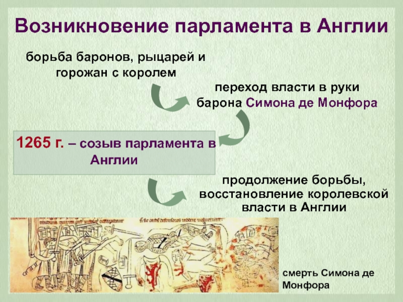 Возникновение парламента в Англииборьба баронов, рыцарей и горожан с королемпереход власти в руки барона Симона де Монфорасмерть