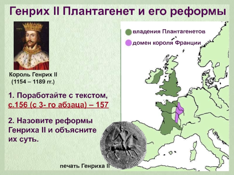 Генрих II Плантагенет и его реформыКороль Генрих II (1154 – 1189 гг.)1. Поработайте с текстом, с.156 (с