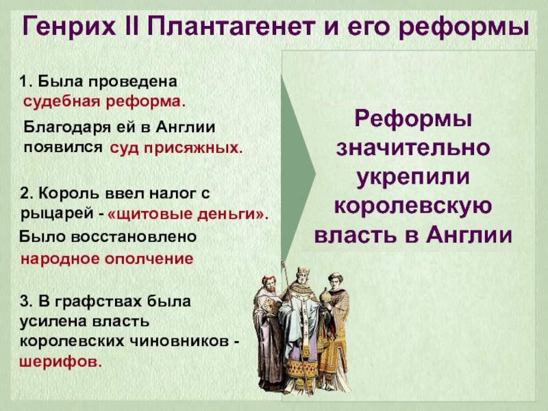 1. Была проведена3. В графствах была усилена власть королевских чиновников - судебная реформа.Благодаря ей в Англии появился