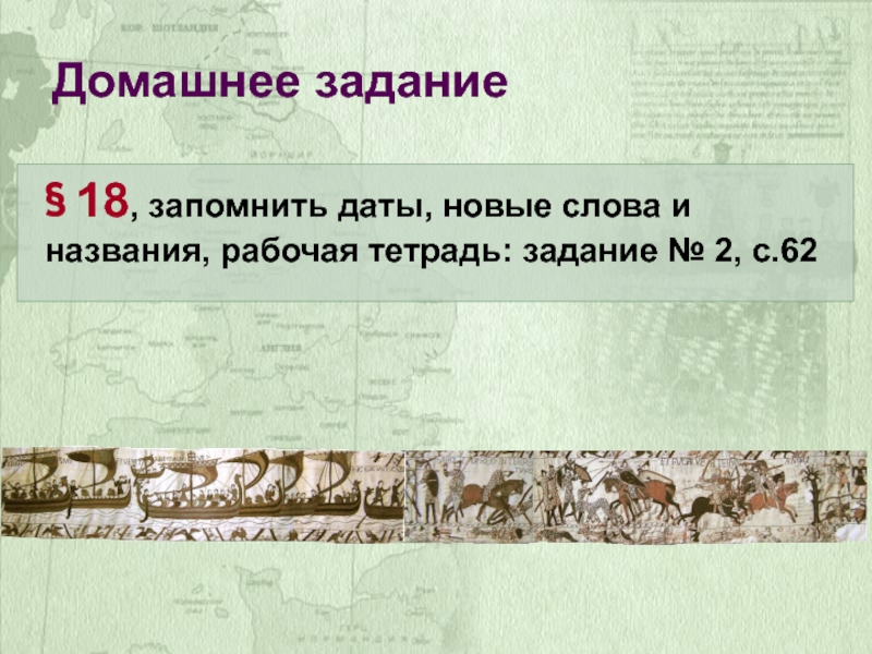 Домашнее задание§ 18, запомнить даты, новые слова и названия, рабочая тетрадь: задание № 2, с.62