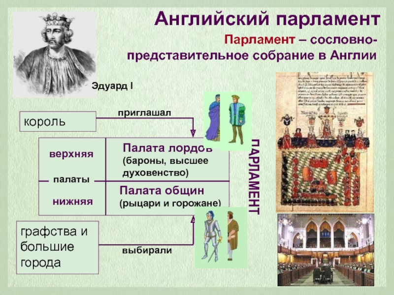 Парламент – сословно-представительное собрание в Англии Английский парламентЭдуард IприглашалвыбиралиПАРЛАМЕНТграфства и большие городакороль