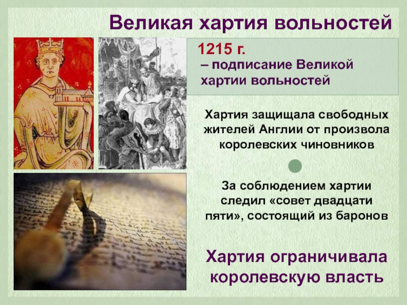 Великая хартия вольностей– подписание Великой хартии вольностей1215 г.Хартия защищала свободных жителей Англии от произвола королевских чиновниковЗа соблюдением