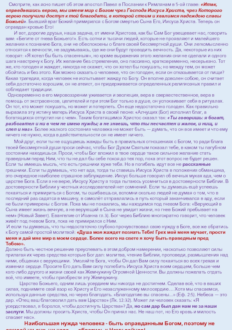 И если ты думаешь, что ты недостаточно глубоко прочувствовал свою нужду в Боге, все же обратись к Богу самой простой молитвой: «Душа моя жаждет познать Тебя! Грех мой меня мучает, прости меня и дай мне мир в моем сердце. Более всего на свете я хочу быть праведным пред Тобою».
