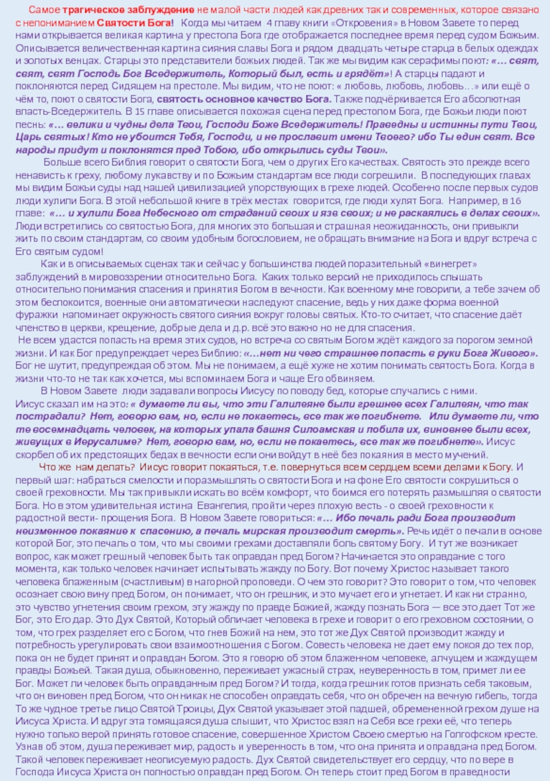 Не всем удастся попасть на время этих судов, но встреча со святым Богом ждёт каждого за порогом земной жизни. И как Бог предупреждает через Библию: «…нет ни чего страшнее попасть в руки Бога Живого». Бог не шутит, предупреждая об этом. Мы не понимаем, а ещё хуже не хотим понимать святость Бога. Когда в жизни что-то не так как хочется, мы вспоминаем Бога и чаще Его обвиняем.