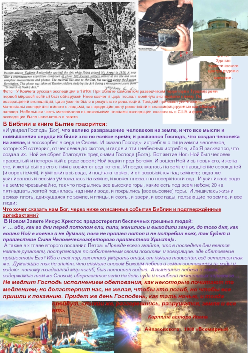 Фото: У Ковчега русская экспедиция в 1916г. При облёте самолётом разведчиком территории Турции(время первой мировой войны) был обнаружен Ноев ковчег и царь послал военную экспедицию к нему. По возвращении экспедиции, царя уже не было в результате революции. Троцкий приказал уничтожить материалы экспедиции вместе с людьми, как вредящие делу революции и классифицируемые как «белый» заговор. Небольшая часть материалов с несколькими членами экспедиции оказалась в США и фото экспедиции было напечатано в газете.
