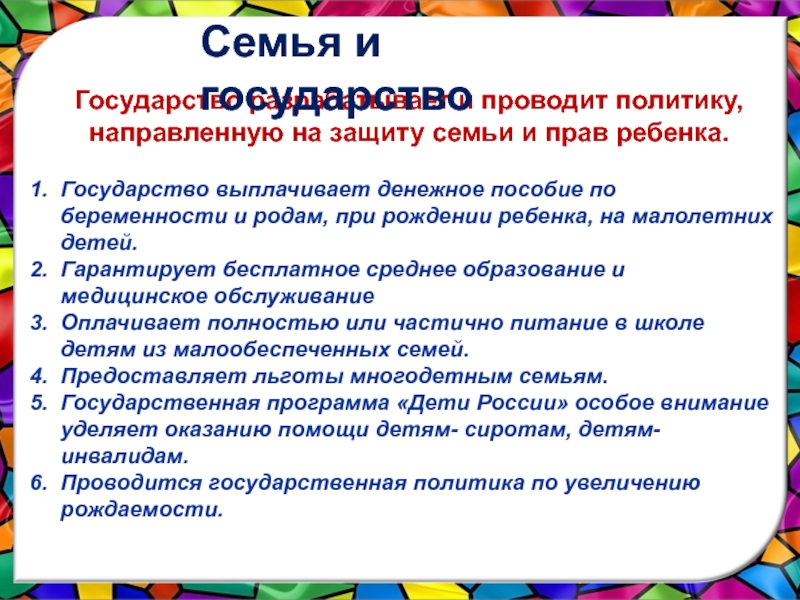 - на заботу, воспитание со стороны родителей и лиц, их заменяющих, а также государства (в том случае, если ребенок остается без попечения родителей);