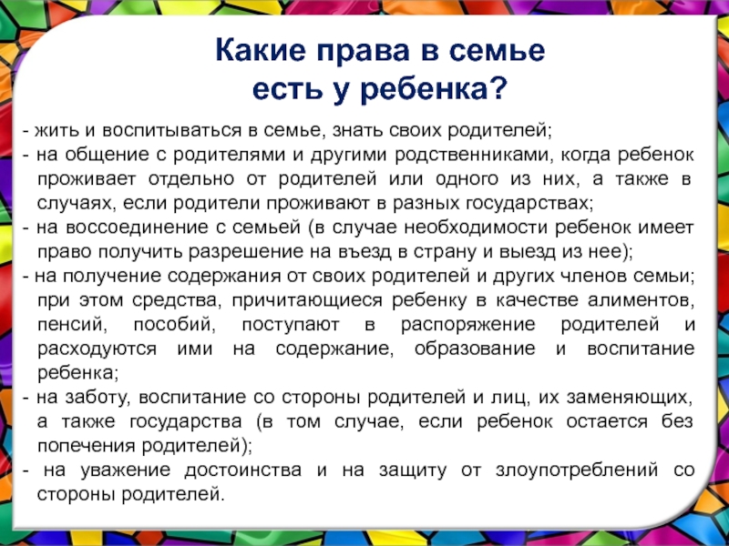 - на уважение достоинства и на защиту от злоупотреблений со стороны родителей.