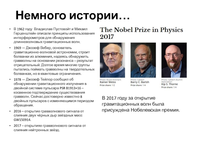 В 2017 году за открытие гравитационных волн была присуждена Нобелевская премия.