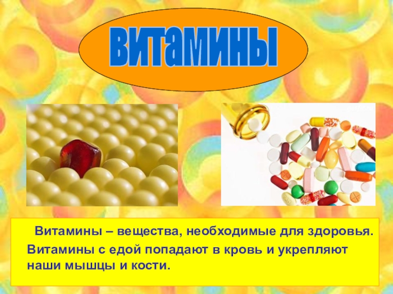 витамины Витамины – вещества, необходимые для здоровья.Витамины с едой попадают в кровь и укрепляютнаши мышцы и кости.