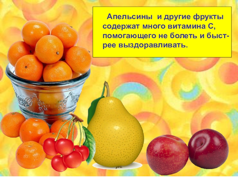 Апельсины и другие фрукты содержат много витамина С,помогающего не болеть и быст-рее выздоравливать.