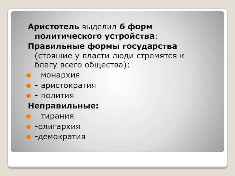 Слайд 5Аристотель выделил 6 форм политического устройства: