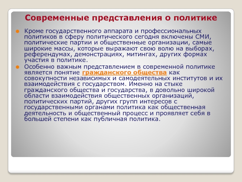 Особенно важным представлением в современной политике является понятие гражданского общества как совокупности независимых и самодеятельных институтов и их взаимодействия с государством. Именно на стыке гражданского общества и государства, в довольно широкой области взаимодействия общественных организаций, политических партий, других групп интересов с государственными органами политика как общественная деятельность и общественный процесс и проявляет себя в большей степени как публичная политика.