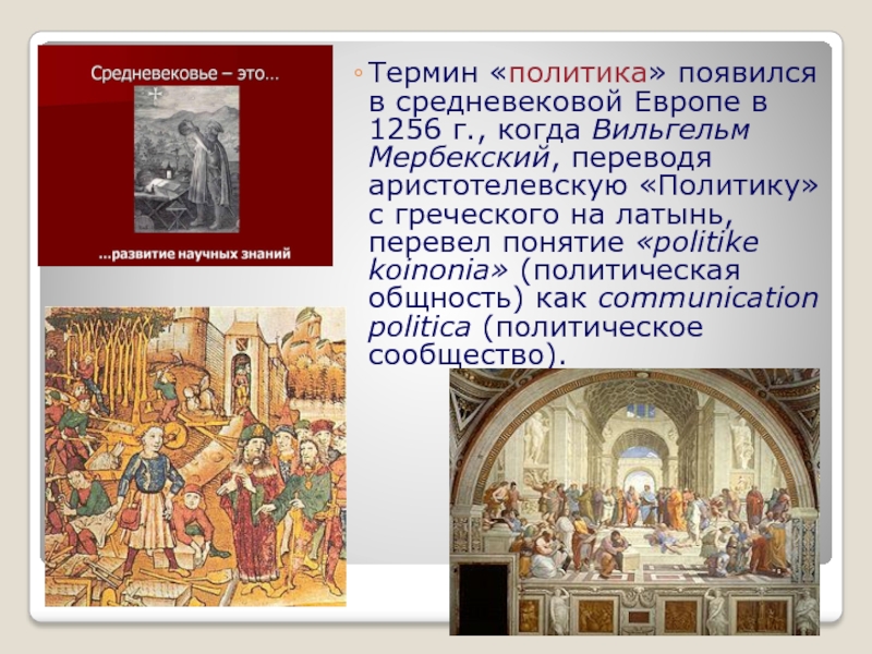 Слайд 6Термин «политика» появился в средневековой Европе в 1256 г., когда