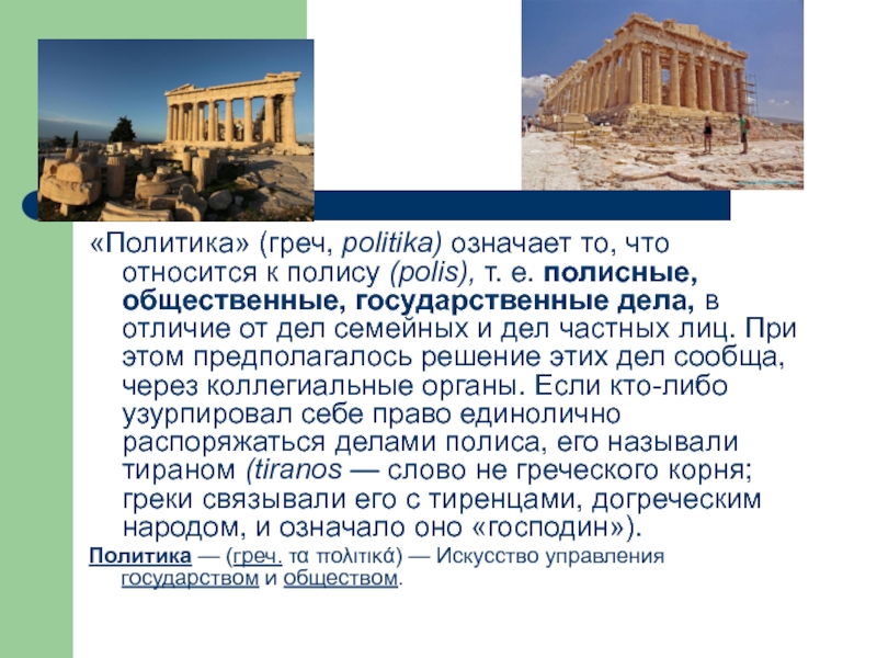 Слайд 3«Политика» (греч, politika) означает то, что относится к полису (polis),