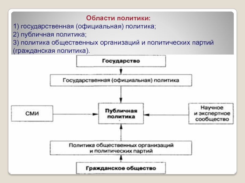 узкие области человеческой деятельности и приложения усилий. Например, экономическая политика включает такие субсферы, как финансовая политика, сырьевая политика, энергетическая политика, производственная политика, транспортная политика, торговая политика и другие виды политики в экономической сфере. Социальная политика включает политики в области образования, здравоохранения, пенсионного обеспечения, заработной платы и т. д. Культурная политика подразделяется на политику в области музейного дела, театра, литературы, музыки, кинематографии, спорта, развития и продвижения в мире языка и культурных достижений данной нации.
