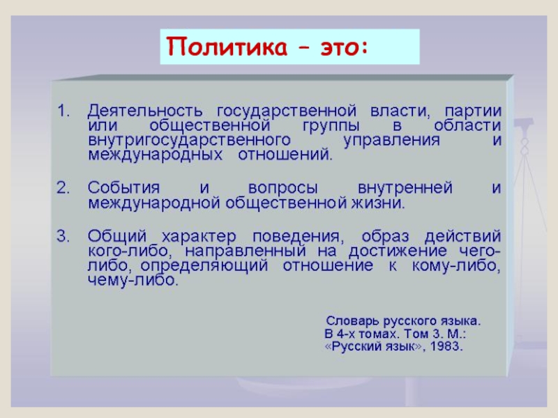 Политика — (греч. τα πολιτικά) — Искусство управления государством и обществом.