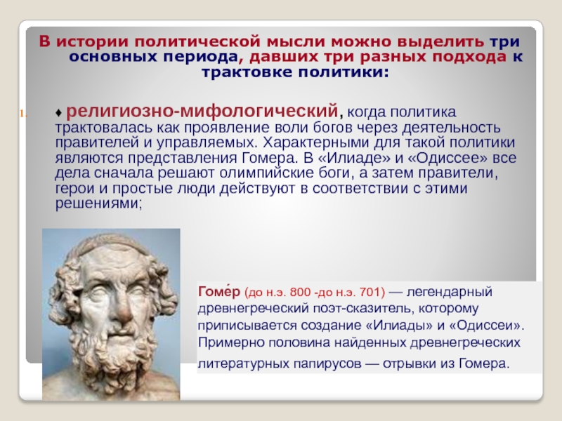 как проявление воли богов через деятельность правителей и управляемых. Характерными для такой политики являются представления Гомера. В «Илиаде» и «Одиссее» все дела сначала решают олимпийские боги, а затем правители, герои и простые люди действуют в соответствии с этими решениями;