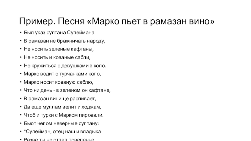 Слайд 43Пример. Песня «Марко пьет в рамазан вино»