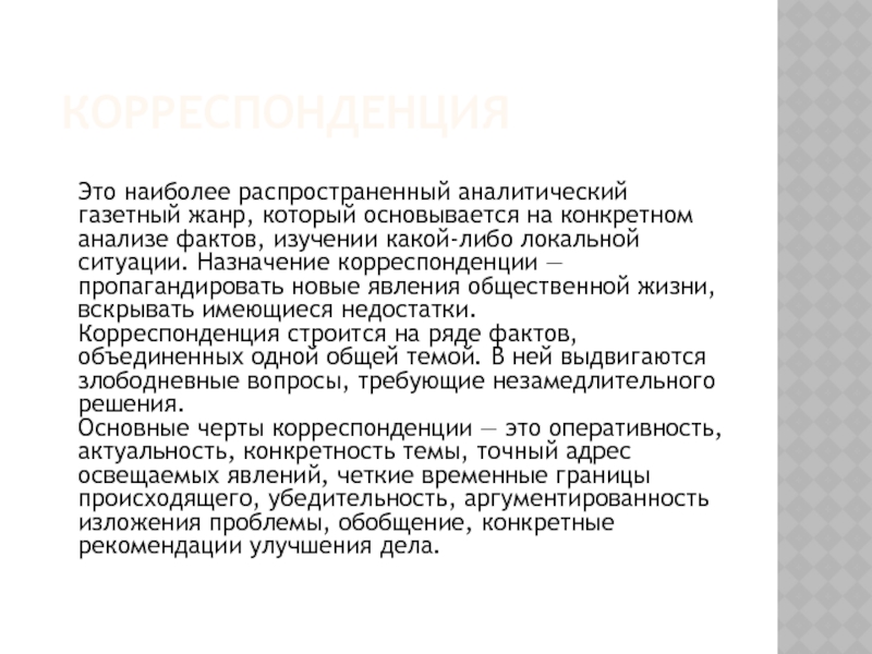 на конкретном анализе фактов, изучении какой-либо локальной ситуации. Назначение корреспонденции