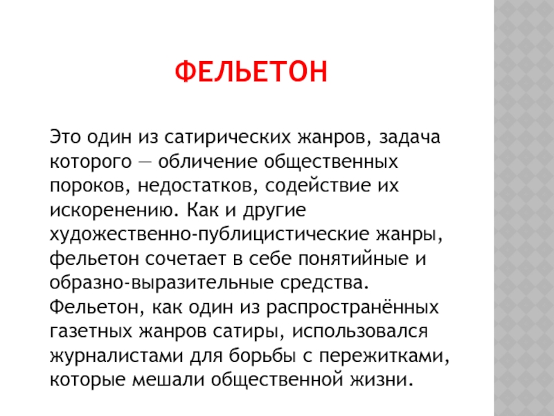 Фельетон, как один из распространённых газетных жанров сатиры, использовался журналистами для борьбы с пережитками, которые мешали общественной жизни.