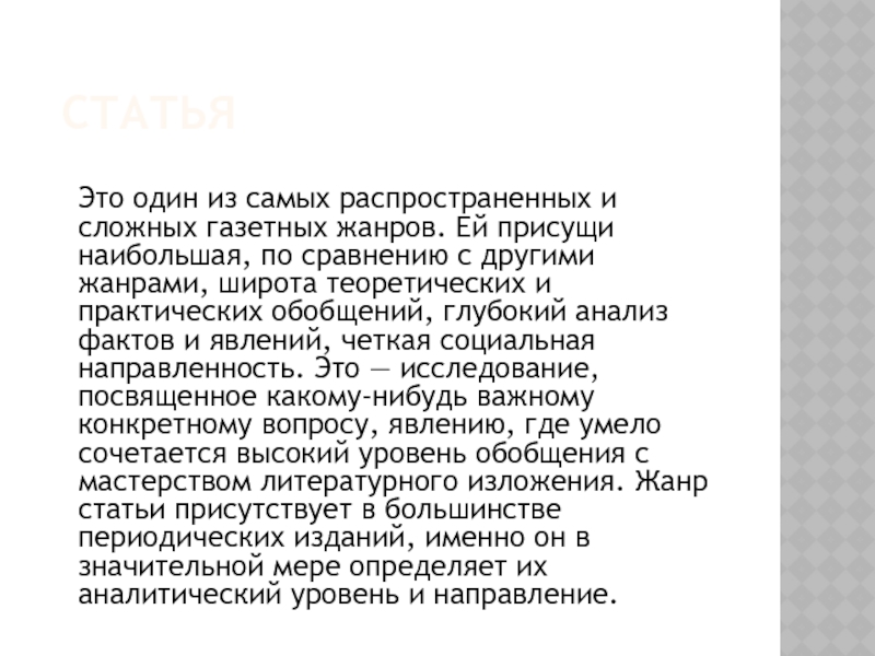 теоретических и практических обобщений, глубокий анализ фактов и явлений, четкая социальная направленность. Это — исследование, посвященное какому-нибудь важному конкретному вопросу, явлению, где умело сочетается высокий уровень обобщения с мастерством литературного изложения. Жанр статьи присутствует в большинстве периодических изданий, именно он в значительной мере определяет их аналитический уровень и направление.