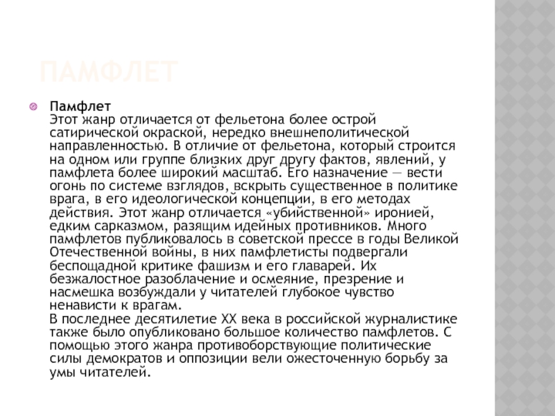 одном или группе близких друг другу фактов, явлений, у памфлета более широкий масштаб. Его назначение — вести огонь по системе взглядов, вскрыть существенное в политике врага, в его идеологической концепции, в его методах действия. Этот жанр отличается «убийственной» иронией, едким сарказмом, разящим идейных противников. Много памфлетов публиковалось в советской прессе в годы Великой Отечественной войны, в них памфлетисты подвергали беспощадной критике фашизм и его главарей. Их безжалостное разоблачение и осмеяние, презрение и насмешка возбуждали у читателей глубокое чувство ненависти к врагам.