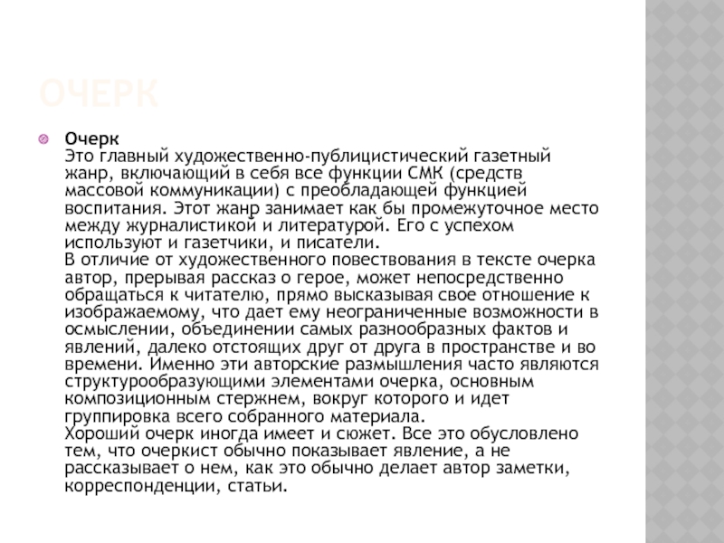 занимает как бы промежуточное место между журналистикой и литературой. Его с успехом используют и газетчики, и писатели.