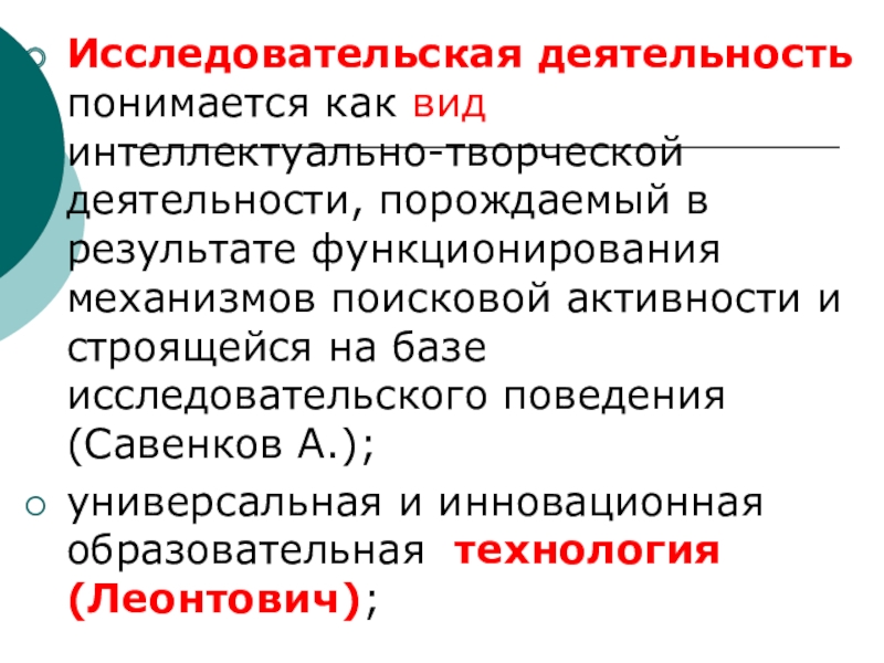 Слайд 2Исследовательская деятельность понимается как вид интеллектуально-творческой деятельности, порождаемый в результате