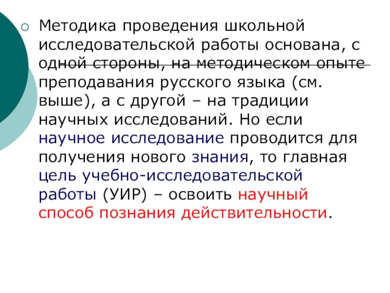 – на традиции научных исследований. Но если научное исследование проводится для получения нового знания, то главная цель учебно-исследовательской работы (УИР) – освоить научный способ познания действительности.