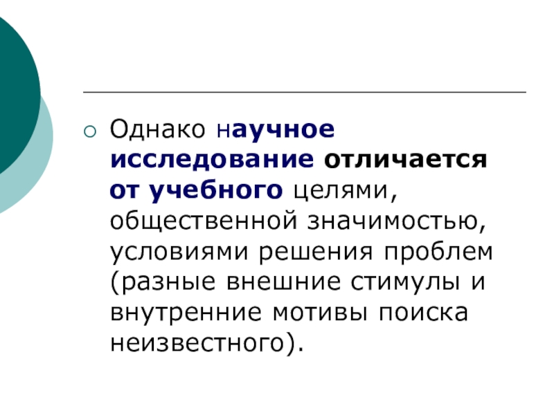 Слайд 13Однако научное исследование отличается от учебного целями, общественной значимостью, условиями решения