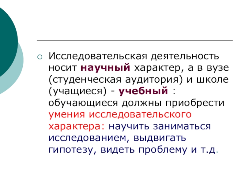 Слайд 3Исследовательская деятельность носит научный характер, а в вузе (студенческая аудитория)
